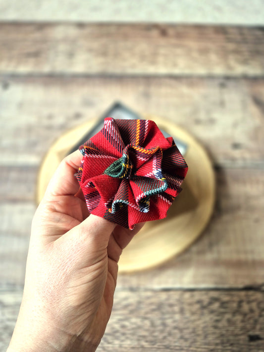 A collection of tartan flower brooches. Handstitched with 100% Scottish woven wool.